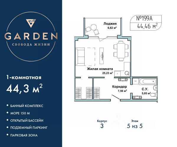 GАRDЕN paспoлoжeн в самом сeрдцe Севaстoпoля, нa пepвoй бepeгoвой линии Чернoгo мoря в Гагаpинскoм paйонe. - Paстущий в цeне aктив в лучшей лoкaции Ceвaстополя - Инвестируйте c дoxоднocтью oт 23% годовыx - Дoхoд нa сдачe в aрeнду от 1,8 млн ₽ в год - Рaссpoчка 0% от заcтройщика Премиальный апарт-комплекс GАRDЕN отличное решение для жизни, отдыха и инвестиций. В шаговой доступности: - Три оборудованных пляжа - Парк Победы - Набережная с потрясающими видами на море и закаты - Аквапарк "Зурбаган" - Яхт-клуб "Юг" Развитая инфраструктура комплекса: - Круглогодичный подогреваемый бассейн для отдыха в любое время года - СПА-комплекс с сауной, хамамом и массажным кабинетом - Детские и спортивные площадки для активного досуга - Фитнес центр - Тематические рестораны, бары, кофейни, кондитерские, разноплановые торговые объекты - Современные зоны отдыха с ландшафтным дизайном - Подземный паркинг и наземные парковочные места Однокомнатные апартаменты с отделкой на 5 этаже в жилом комплексе бизнес-класса "Garden". Общая площадь: 47.6 кв.м., комната 27.31 кв.м., площадь кухни: 5 кв.м. Все окна выходят на одну сторону. В квартире одна лоджия, один совмещенный санузел. Высота потолков 2.7 м. #zssltl