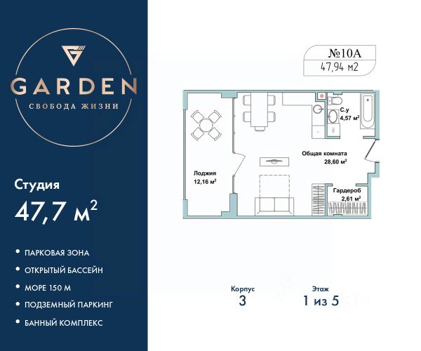 GARDEN расположен в самом сердце Севастополя, на первой береговой линии Черного моря в Гагаринском районе. - Растущий в цене актив в лучшей локации Севастополя - Инвестируйте c доходностью от 23% годовых - Доход на сдаче в аренду от 1,8 млн ₽ в год Премиальный апарт-комплекс GARDEN отличное решение для жизни, отдыха и инвестиций. В шаговой доступности: - Три оборудованных пляжа - Парк Победы - Набережная с потрясающими видами на море и закаты - Аквапарк "Зурбаган" - Яхт-клуб "Юг" Развитая инфраструктура комплекса: - Круглогодичный подогреваемый бассейн для отдыха в любое время года - СПА-комплекс с сауной, хамамом и массажным кабинетом - Детские и спортивные площадки для активного досуга - Фитнес центр - Тематические рестораны, бары, кофейни, кондитерские, разноплановые торговые объекты - Современные зоны отдыха с ландшафтным дизайном Застройщик ООО "СЗ "Грин", ИНН 9201004298, адрес: Республика Крым, г. Севастополь, ул.Летчиков, корпус 3-4, секция 1, 2 этаж 2-комн. апартаменты с европланировкой с отделкой в жилом комплексе бизнес-класса "Garden". Общая площадь: 47.7 кв.м., жилые комнаты 10 и 13.6 кв.м., общая площадь гостиной-столовой с кухонной зоной: 15 кв.м. Комнаты изолированные, все окна выходят на одну сторону. В квартире один балкон, один совмещенный санузел. Высота потолков 2.7 м. #2MzUdw