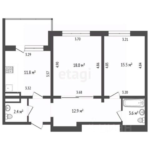 две раздельные просторные спальни 18 и 12 кв.м. Кухня 8 кв.м. Раздельный сантехнический узел.