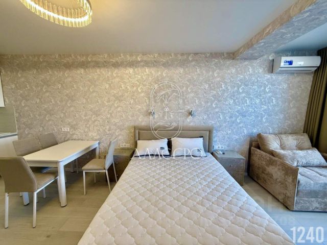 Апартаменты - студия 29 м2, состоят из комнаты 21,64 м2, совмещенного санузла 2,8 м2 и просторной террасы 6,5 м2 с которой открывается великолепный вид на город, парк и Стрелецкую бухту.