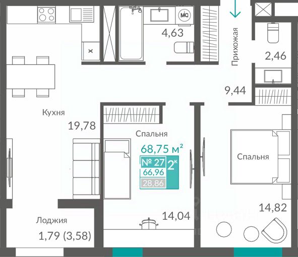 Продаётся 2-комнатная квартира в строящемся доме (Секция 2), срок сдачи: III-кв. 2027, общей площадью 66.96 кв.м., на 4 этаже. Новый жилой квартал "Видный" от застройщика "Монолит" расположен по адресу Севастополь, Балаклавское шоссе