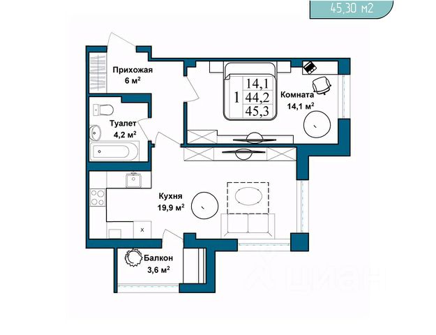 -Площадь спальни: 14 м2