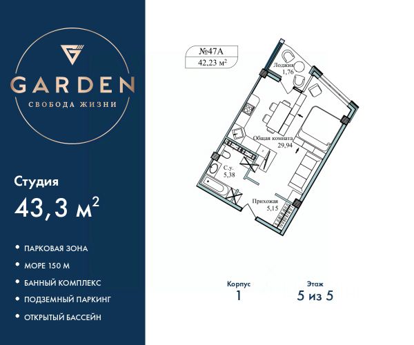 Апарт-комплекс "Акватория" - это:2 корпуса, крытый паркинг, 9 этажей (7 жилых);первая береговая линия, 10 метров до обустроенного пляжа;развитая городская инфраструктура в шаговой доступности;ввод в эксплуатацию III квартал 2024 гпродажи через эскроу-счет