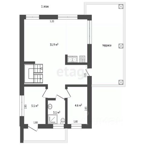В доме кухня-гостиная расположена на первом этаже, санузел совмещенный.