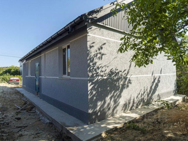 - Стены: ракушечник, утепленыпенопластом (50 мм), оштукатурены камешковой штукатуркой.Внутри дома предчистовая отделка, гипсоваяштукатурка.