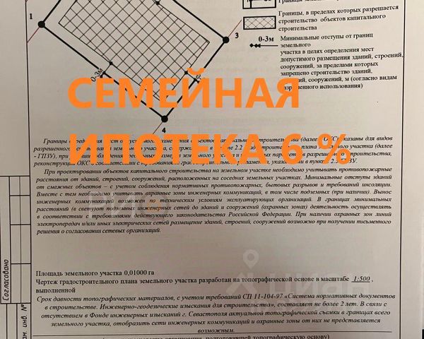 Арт. 107379433 Продается участок земли 5 соток! РОВНЫЙ, БЕЗ УКЛОНА, БЕЗ ОГРАНИЧЕНИЙ НА СТРОИТЕЛЬСТВО, БЕЗ НЮАНСОВ, БЕЗ ОБРЕМЕНЕНИЙ. НЕ АРЕНДА, СОБСТВЕННОСТЬ, Коммуникации: электричество от СевЭнерго, водоснабжение городское. На участок получен ГПЗУ. Соотношение сторон: 12,5 - фасад, 40 - глубина. Участок можно приобрести в ипотеку. Кадастровый номер: 91:04:019001:106.