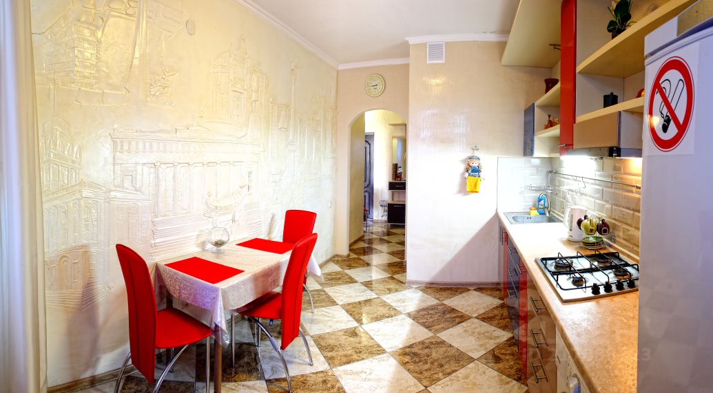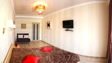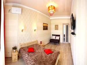 Просторная кухня (9 кв. м. ) с выходом на лоджию и с шикарным барельефом "Историческая гордость Севастополя"на стене. Комната 18 кв. м. , выход на балкон, французский потолок, элегантные обои, красивая люстра и стильные бра, двухспальная кровать, диванчик, плазменный ТВ. Спутниковое телевидение (более 100 каналов, ), Wi-FI Интернет.