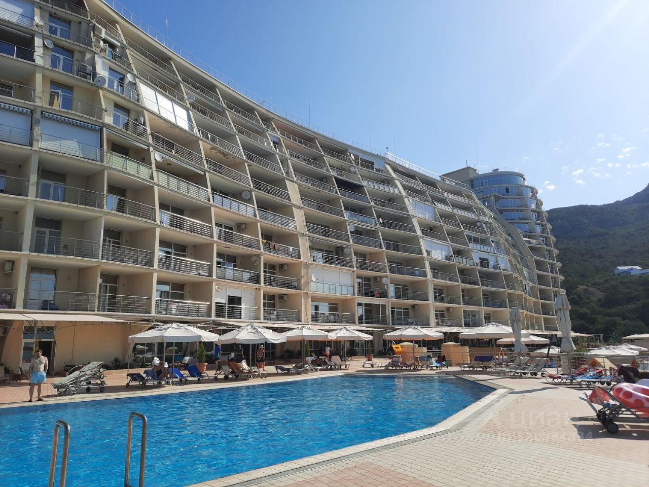 На территории бесплатно шезлонги, зонтики у бассейна.