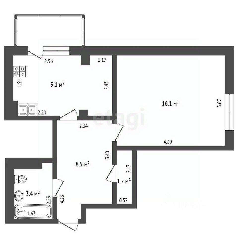 Кухня - 9,1 м кв, с кухни выход на лоджию ~ 4 м кв