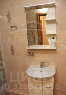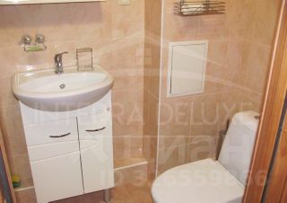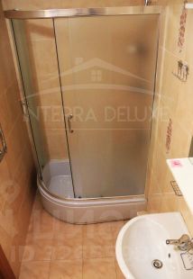 - Совмещенный санузел: душевая, раковина с тумбой, навесное зеркало с полками, инсталляция