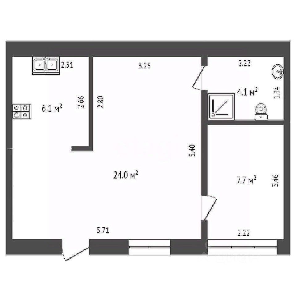 Общая площадь: 43,6 м2