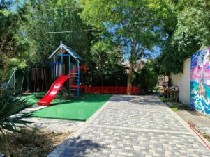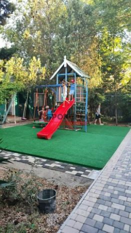 - размещена детская площадка с батутом, установлены качели