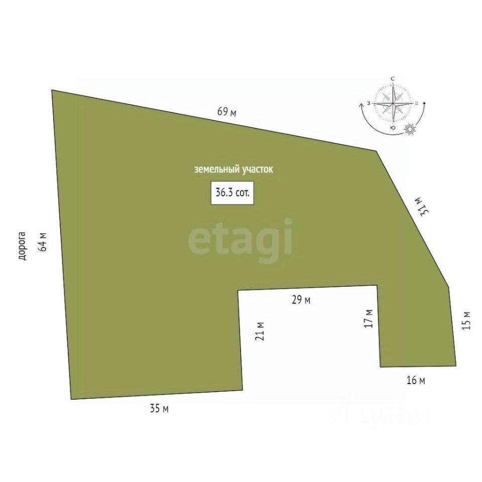 - Общая площадь: 3630 м² (36 соток)