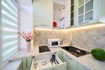 В каждый блок войдут: комната 17 м², кухня 10 м², санузел 5 м². Полный набор бытовой техники: посудомоечная машина, стиральная машина, кондиционер, водяные теплые полы, Smart TV, WiFi.