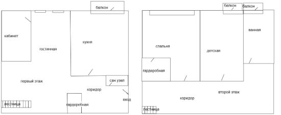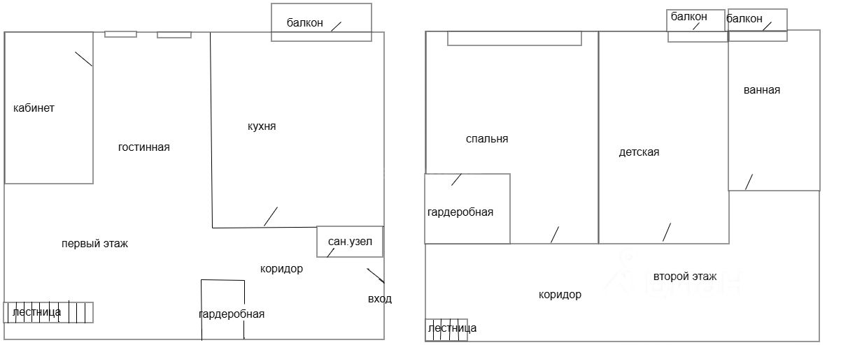 Планировка: 1- ый этажа: прихожая и гардеробная, ванная, кухня, гостинная, спальня, 2 - ой этаж - две комнаты, ванная комната, два балкона.