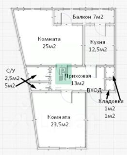 Планировка квартиры на 2 стороны, с изолированными комнатами площадью: 25 м2 и 23.5 м2, комнаты просторные и светлые. Большая кухня, правильной формы, площадью:12.5 м2, позволяет зонировать на рабочую и обеденную зоны.