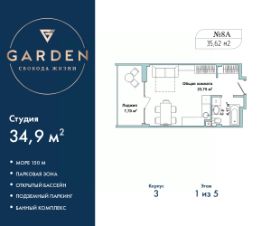 Однокомнатные апартаменты-студия с отделкой в жилом комплексе бизнес-класса "Garden". Общая площадь: 34.9 кв.м., площадь гостиной с кухонной зоной 23.75 кв.м. Все окна выходят на одну сторону. В квартире одна лоджия, один совмещенный санузел. Высота потолков 2.7 м. #2M2uD2