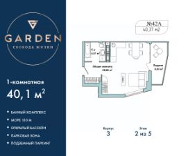 Однокомнатные апартаменты с отделкой в жилом комплексе бизнес-класса "Garden". Общая площадь: 40.1 кв.м., комната 23.88 кв.м., площадь кухни: 5 кв.м. Все окна выходят на одну сторону. В квартире одна лоджия, один совмещенный санузел. Высота потолков 2.7 м. #262uD9