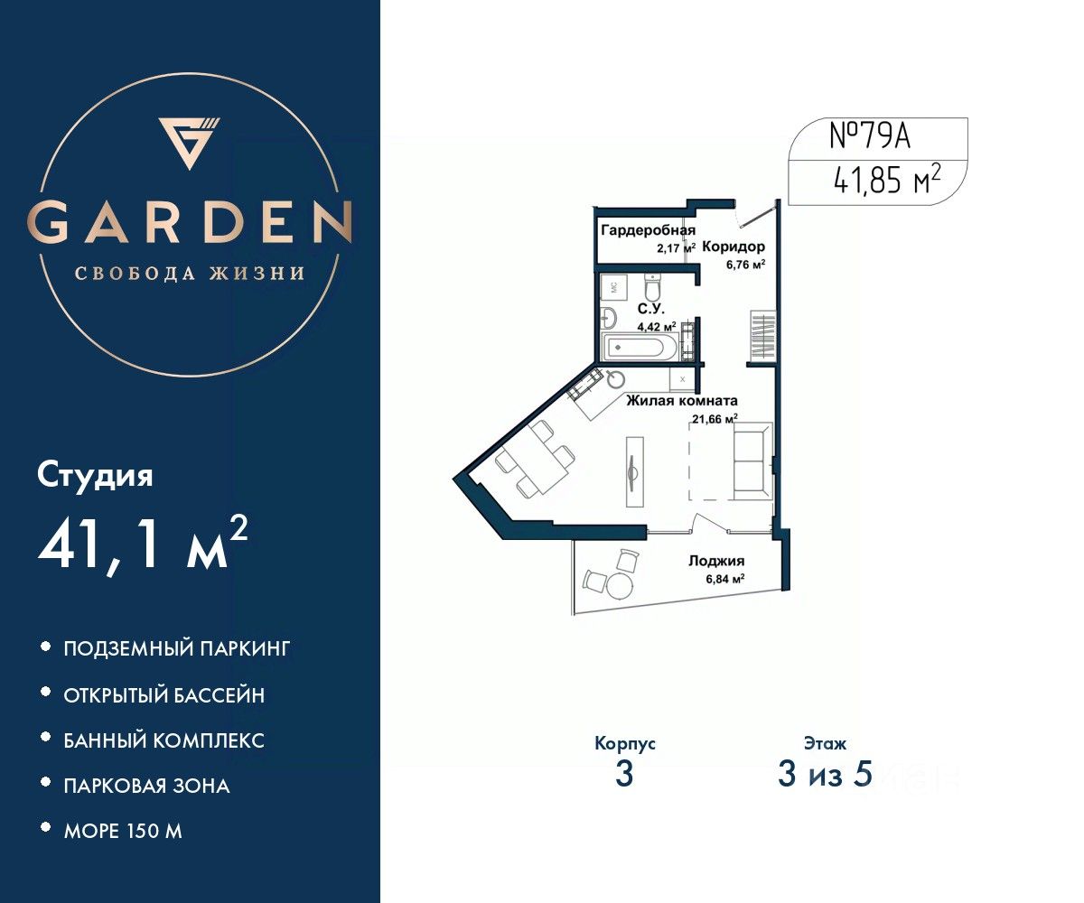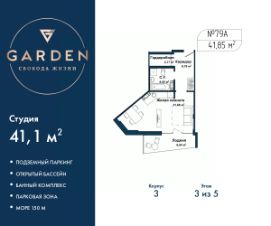 Однокомнатные апартаменты-студия с отделкой на 3 этаже в жилом комплексе бизнес-класса "Garden". Общая площадь: 41.1 кв.м., площадь гостиной с кухонной зоной 27.35 кв.м. Все окна выходят на одну сторону. В квартире одна лоджия, один совмещенный санузел. Высота потолков 2.7 м. #zM2UeD