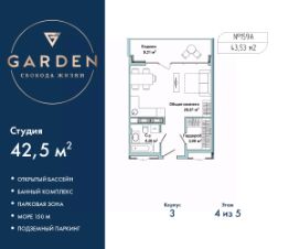 Просторные однокомнатные апартаменты-студия с отделкой на 4 этаже в жилом комплексе бизнес-класса "Garden". Общая площадь: 42.5 кв.м., площадь гостиной с кухонной зоной 26.07 кв.м. Все окна выходят на одну сторону. В квартире одна лоджия, один совмещенный санузел. Высота потолков 2.7 м. #2m2wod