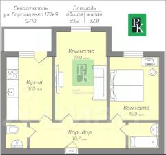 ВИДОВАЯ двухкомнатная квартира площадью 59 м2, на 9/10 м2 этаже дома, с просторной кухней 9.5 м2.