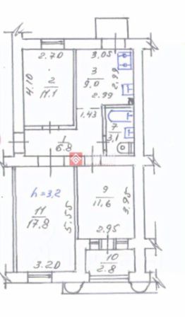 Комнаты раздельные 17.8/11.6/11.1 кв.м., кухня 9 кв.м , из который выход на небольшой балкончик, просторный холл, санузел совмещенный. Из спальни выход на остекленную лоджию. Высота потолков 3.40 м.