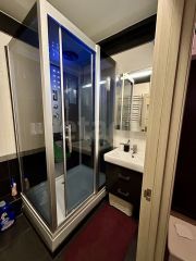 В ванной комнате установлена душевая кабина, встроенный шкаф для удобного хранения всей бытовой химии, а также небольшая, но вместительная стиральная машинка (на 4 кг).