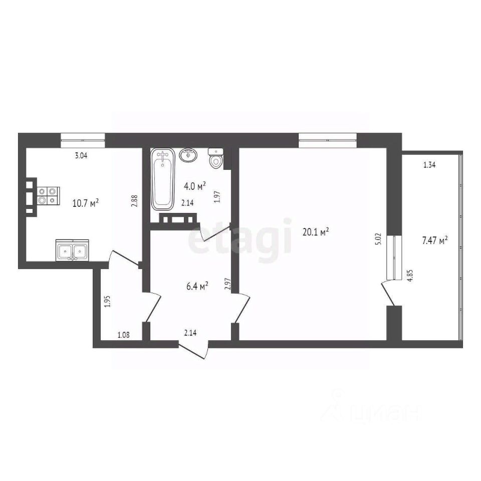 Общая площадь 41.3м2 (не считая лоджию)