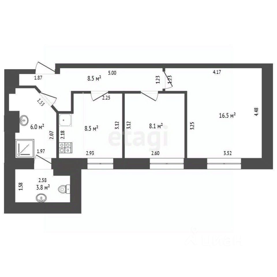 Квартира расположена на четвертом этаже четырёхэтажного дома (мансардный этаж). Удобная планировка: комнаты- 16.5 и 8.1 м2, кухня- 8.5 м2, прихожая- 8.5 м2, санузел раздельный -6 и 3.8 м2. Отопление-АГВ.