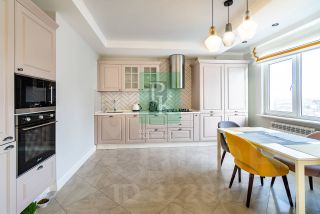 Большая кухня с встроенной мебелью и техникой , гостиная укомплектована мебелью.