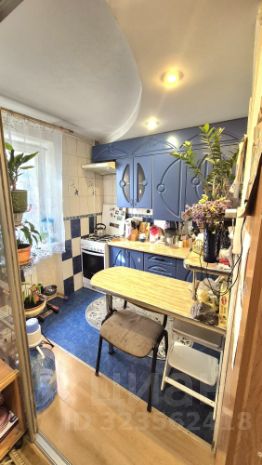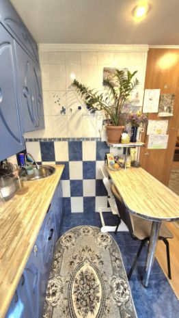 Кухня площадью 5 квадратных метров, со встроенной кухней, газовой колонкой и оригинальным столом, также кухня закрывается - раздвижной дверью.
