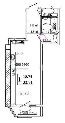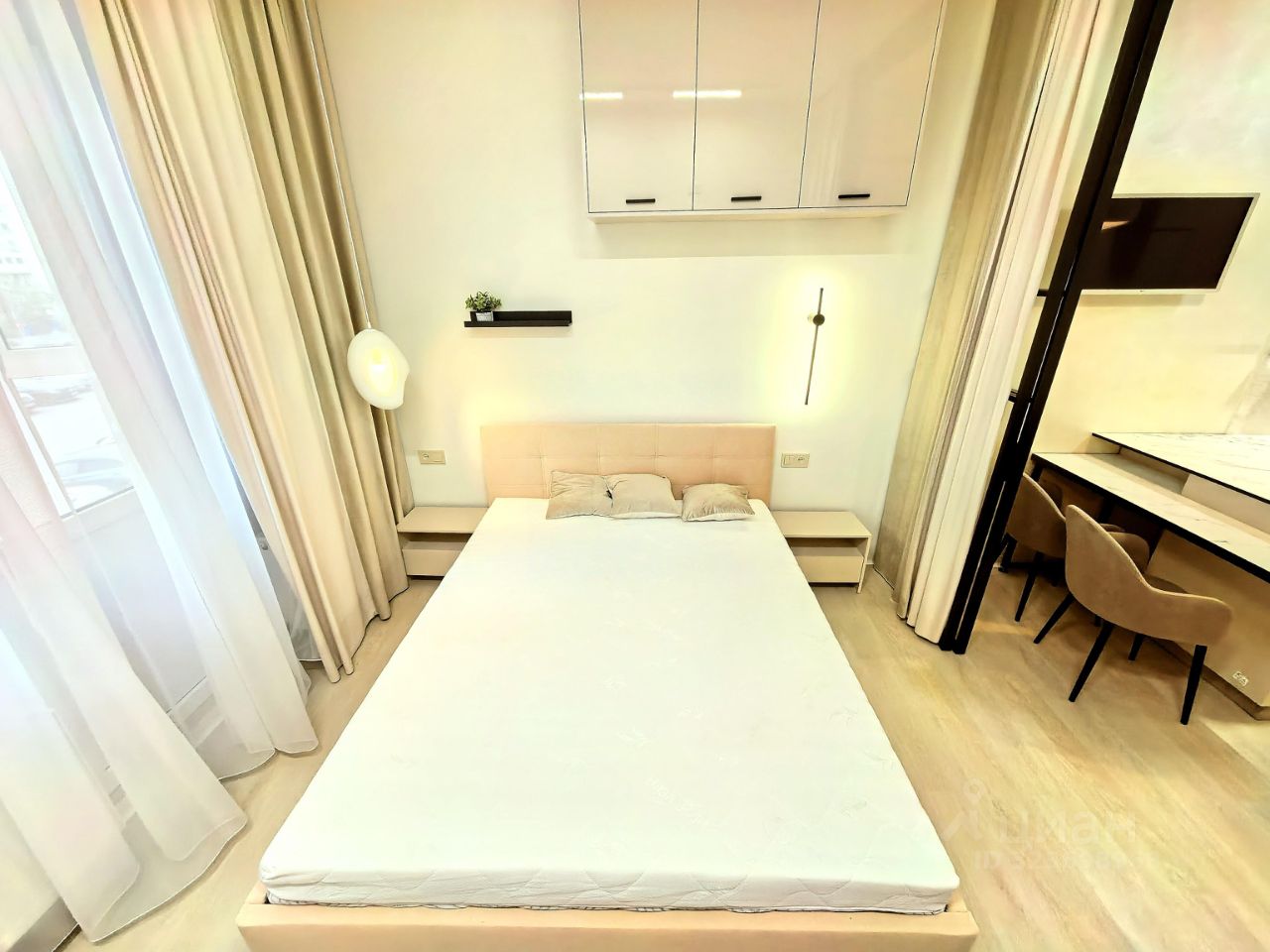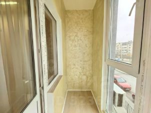 - с зонированием: кухня-гостиная и уютная спальня, совмещенный санузел и гардеробная, коридор, лоджия с панорамным остеклением;
