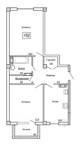Фактическая площадь квартиры с учетом балкона 74 кв. м., согласно Выписки из ЕГРН 67,4 кв. м.