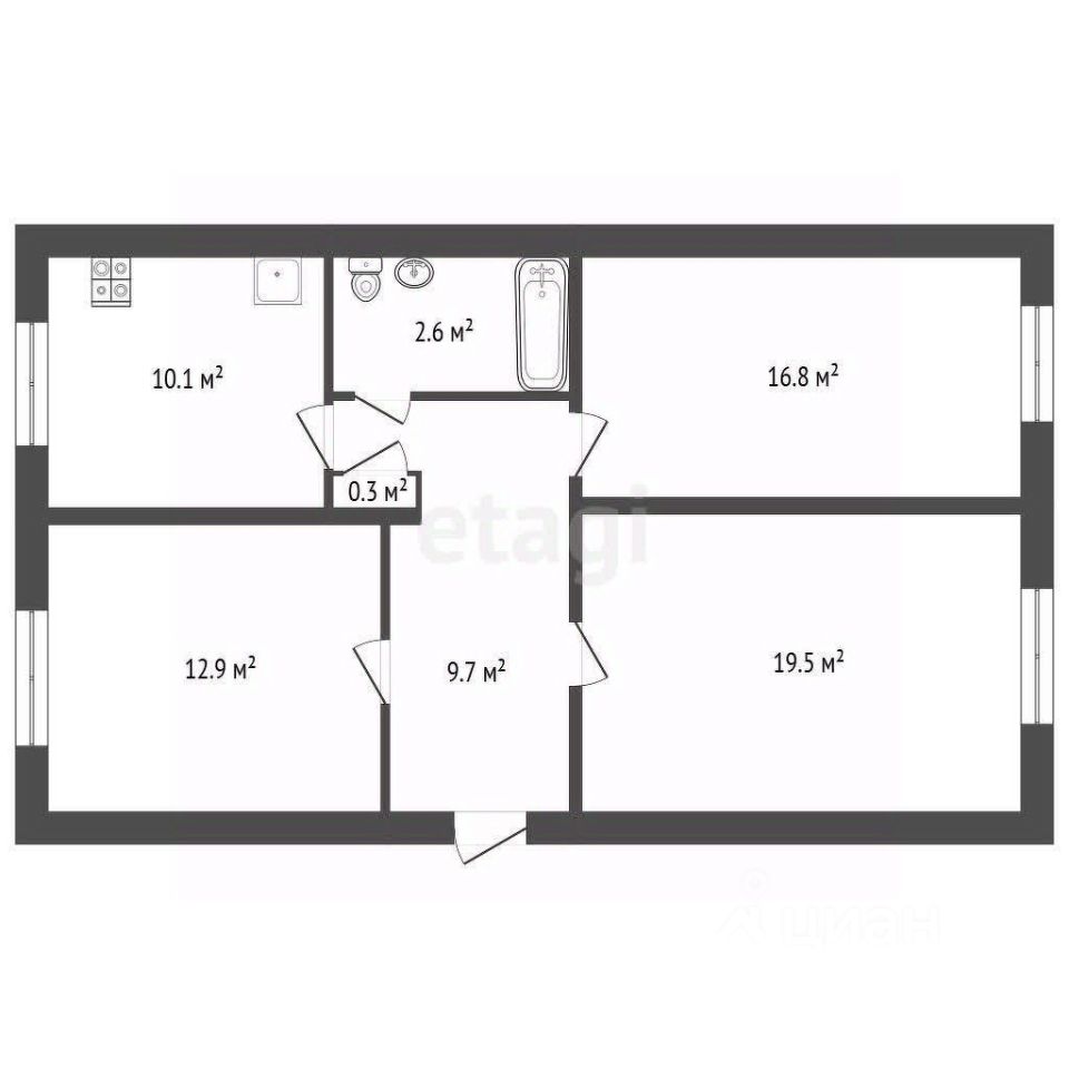 Зал 19,5 кв.м; 2 спальни : 12,9 кв.м, 16,7 кв.м.