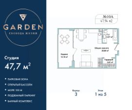 2-комн. апартаменты с европланировкой с отделкой в жилом комплексе бизнес-класса "Garden". Общая площадь: 47.7 кв.м., жилые комнаты 10 и 13.6 кв.м., общая площадь гостиной-столовой с кухонной зоной: 15 кв.м. Комнаты изолированные, все окна выходят на одну сторону. В квартире один балкон, один совмещенный санузел. Высота потолков 2.7 м. #zmz3Dw