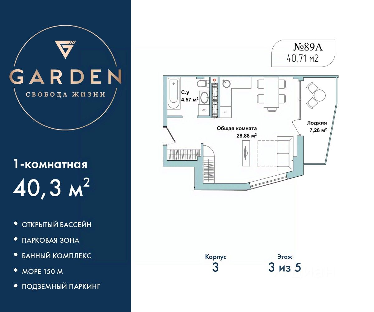 Продаются однокомнатные апартаменты с отделкой на 3 этаже в жилом комплексе бизнес-класса "Garden". Общая площадь: 40.3 кв.м., комната 23.88 кв.м., площадь кухни: 5 кв.м. Все окна выходят на одну сторону. В квартире одна лоджия, один совмещенный санузел. Высота потолков 2.7 м. #zmz3db
