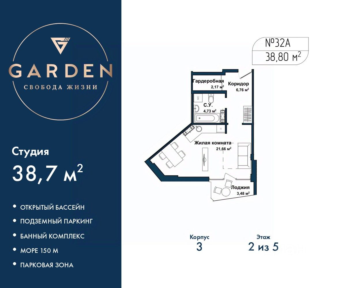 Продаются однокомнатные апартаменты-студия с отделкой в жилом комплексе бизнес-класса "Garden". Общая площадь: 38.7 кв.м., площадь гостиной с кухонной зоной 21.66 кв.м. Все окна выходят на одну сторону. В квартире один балкон, один совмещенный санузел. Высота потолков 2.7 м. #z6ZuE5