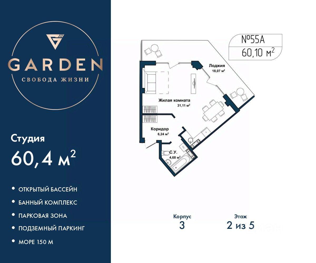 Просторные 1-комн. апартаменты-студия с отделкой в жилом комплексе бизнес-класса "Garden". Общая площадь: 60.4 кв.м., площадь гостиной с кухонной зоной 31.11 кв.м. Все окна выходят на одну сторону. В квартире один балкон, один совмещенный санузел. Высота потолков 2.7 м. #zMZ3Em