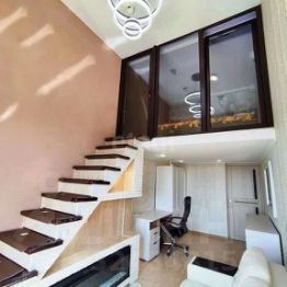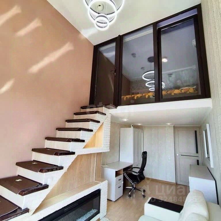 По документам квартира 45 м.кв. За счет высоких потолков оборудован второй уровень: в зале на втором уровне уютная спальня с собственным гардеробом, в кухне также второй уровень, комната, в которой можно сделать кабинет либо детскую. Установлена удобная складная лестница.