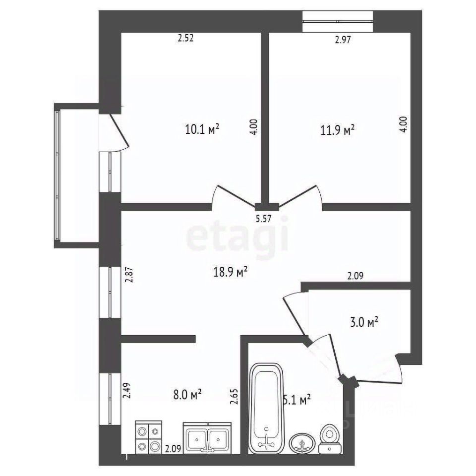 • 3 комнаты (12 м² + 11 м²) — свобода для семьи или гостей