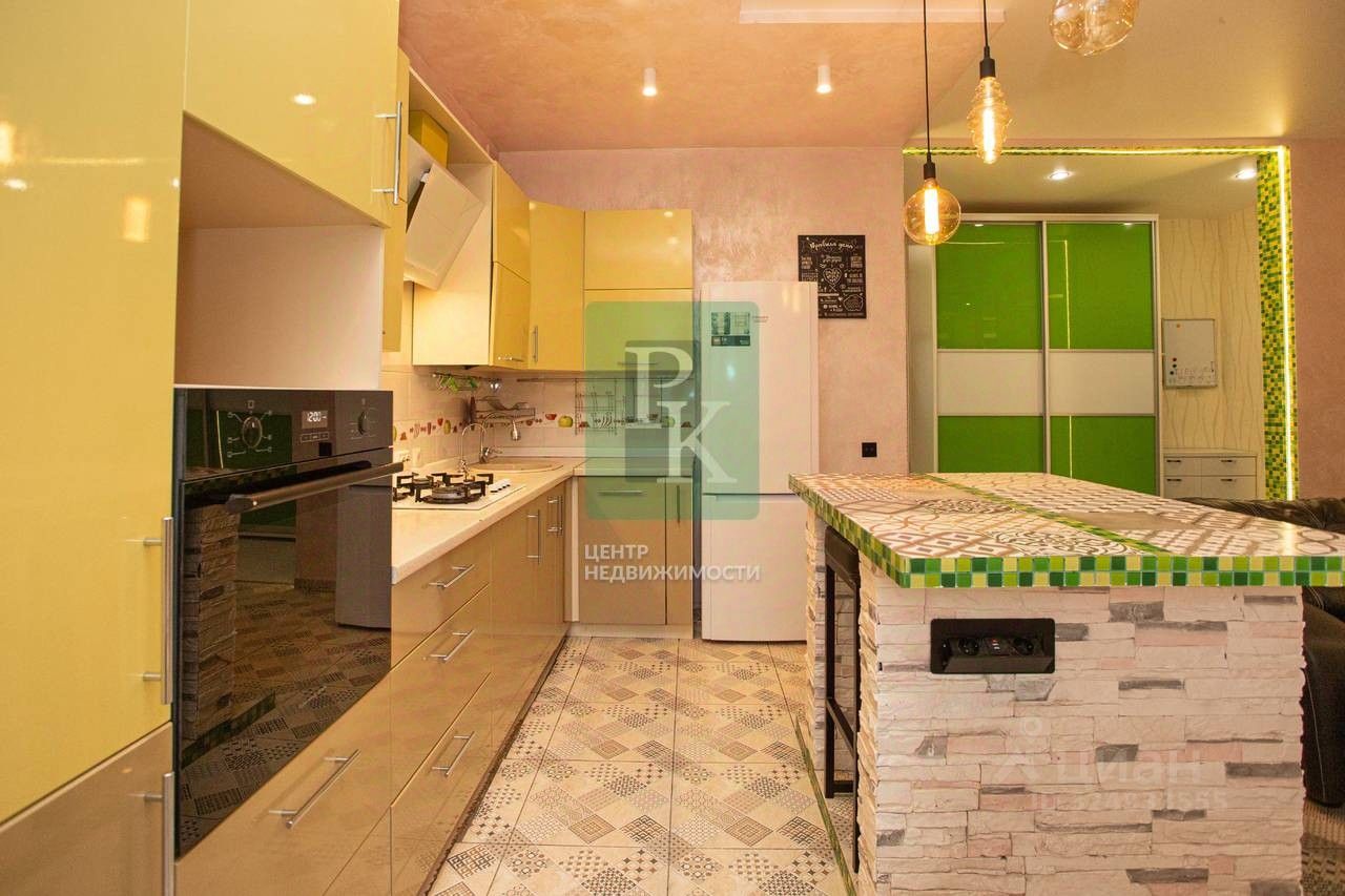 Кухонный гарнитур с островом остается новым собственникам в подарок.