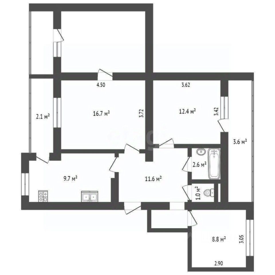 Все комнаты (16,7, 12,4, 14 и 8,8 м²) изолированные, что гарантирует личное пространство для каждого.