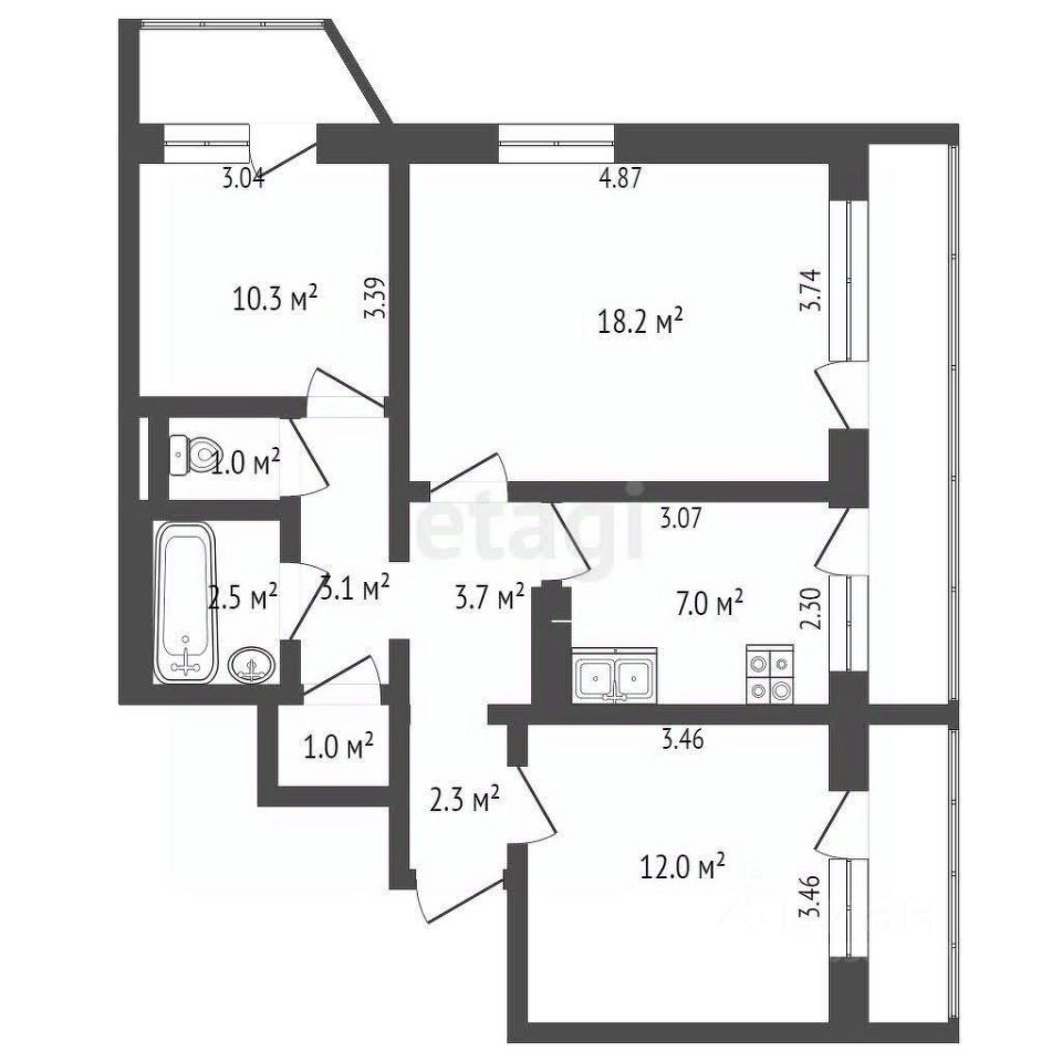 Комнаты:10,3м2;18,2 м2;12 м2