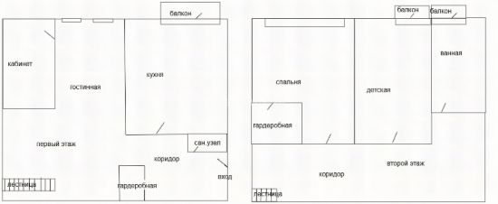 Планировка: 1- ый этажа: прихожая и гардеробная, ванная, кухня, гостинная, спальня, 2 - ой этаж - две комнаты, ванная комната, два балкона.