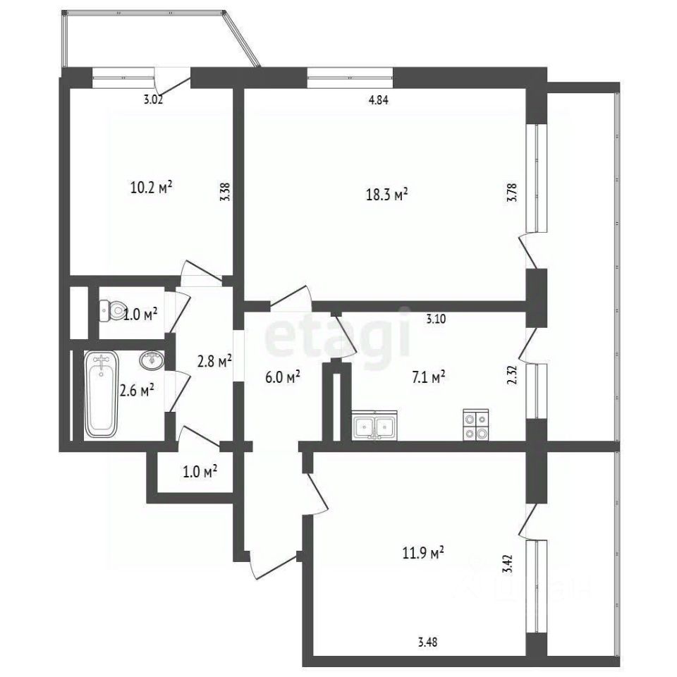 Планировка квартиры - это огромное преимущество: все комнаты изолированные (18.3/11.9/10/3 м2), из каждой комнаты выход на лоджию, где открываются красивый вид на город, на Казачью бухту. Широкая лоджия, можно разместить кабинет, дополнительную зону отдыха. Площадь кухни увеличена за счет выноса оконного блока, что НЕ является перепланировкой. Раздельный санузел. Просторный коридор с нишей для хранения вещей.