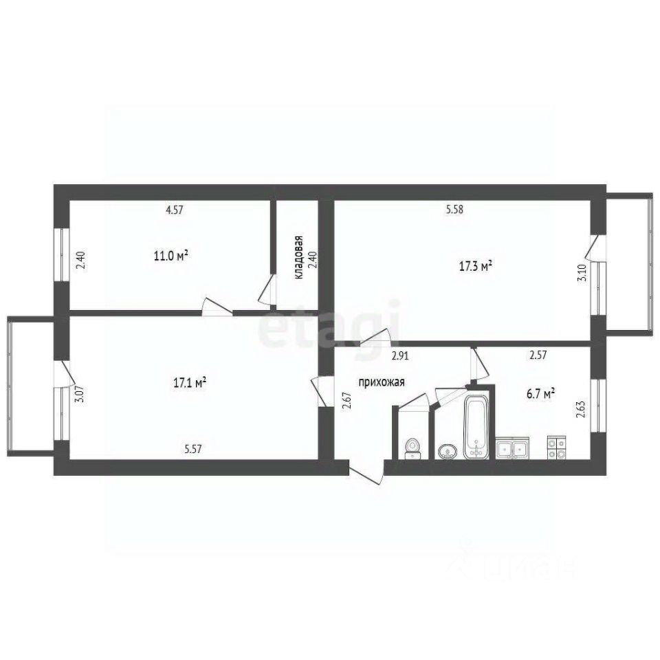 Kомнаты: 17,1 кв.м и 11 кв.м.