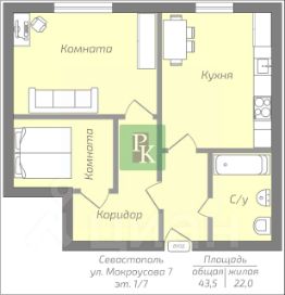 -Общая площадь: 43.5м2