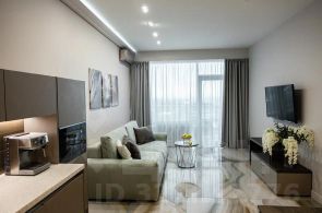 Апартаменты расположены на 5-м этаже, общая площадь 64 м². В состав входит балкон с панорамным видом на море и красивые закаты — идеальное место для отдыха и вдохновения.