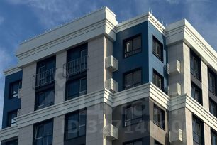 Фасад выполнен в лаконичных белых и серых тонах, верхние этажи - глубокий синий цвет. Материал - вентилируемый керамогранит.