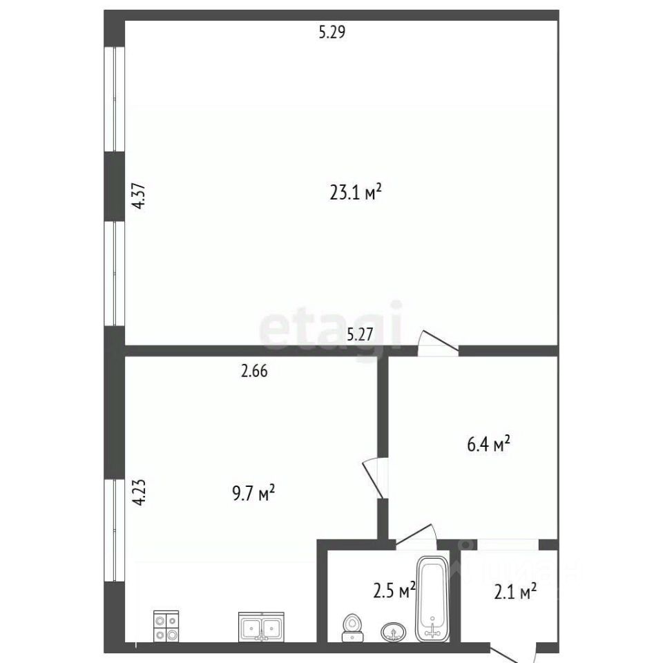 Квартира включает светлую кухню 9.7 кв.м.
